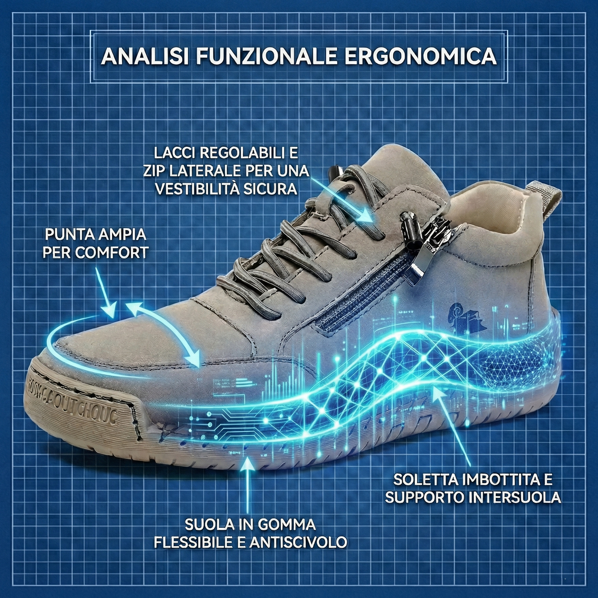 ✓ Suola Antiscivolo: Massima aderenza su superfici bagnate o scivolose. Cammina con stabilità e sicurezza, prevenendo cadute e proteggendo ginocchia e schiena.